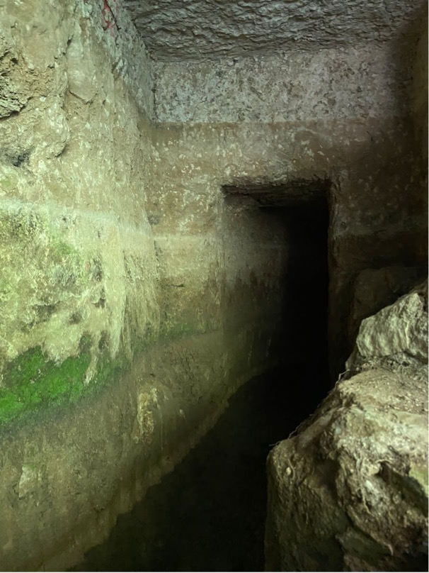 Rechts: Eén van de gangen van het Galermi aquaduct waarbij men naar binnen kan kijken